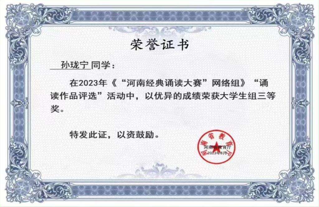 孙珑宁:“河南经典诵读大赛”网络组三等奖