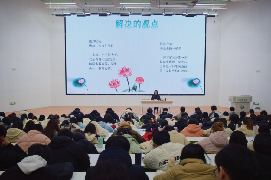 交流环节,许老师结合学生在未来身份转变和准备教师资格证面试中存在的疑惑和问题进行了解答,并建议学生以“共情式沟通”为着手点,抓住教学与班级管理问题中的主要矛盾,建立正向沟通模式,在未来的教师工作中尽快适应角色转变。